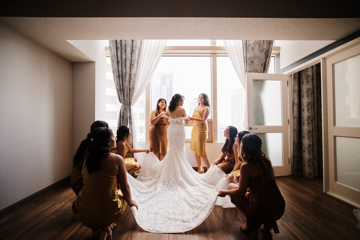 We’ll instruct you to get into your dress close to a window and it would be fabulous to have your bridemaids dressed when you’re getting in your gown!